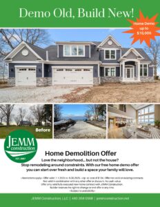 JEMM Construction offers up to $10,000 toward demolition when you sign a contract to build your custom dream home with us.